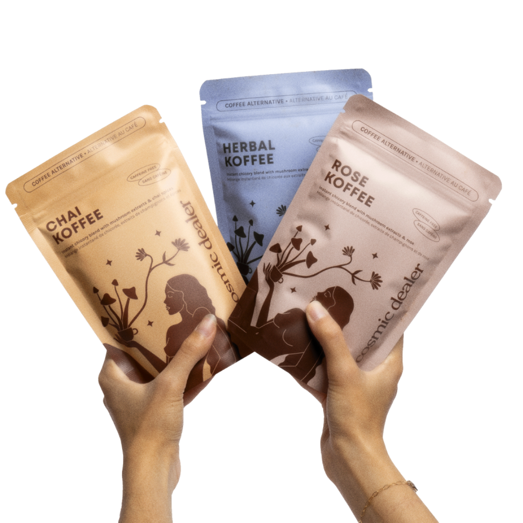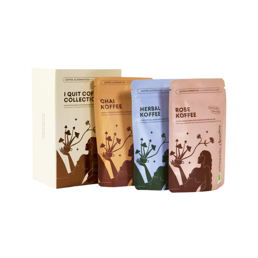 Remplacez votre rituel café par une boisson pleine de sens : ce coffret regroupe trois mélanges torréfiés sans caféine (Herbal, Rose, Chai) à base d’orge, chicorée et seigle, enrichis en extraits de champignons bio (Crinière de Lion, Reishi, Maïtaké) pour un soutien naturel. 100 % bio, vegan, sans sucre raffiné.